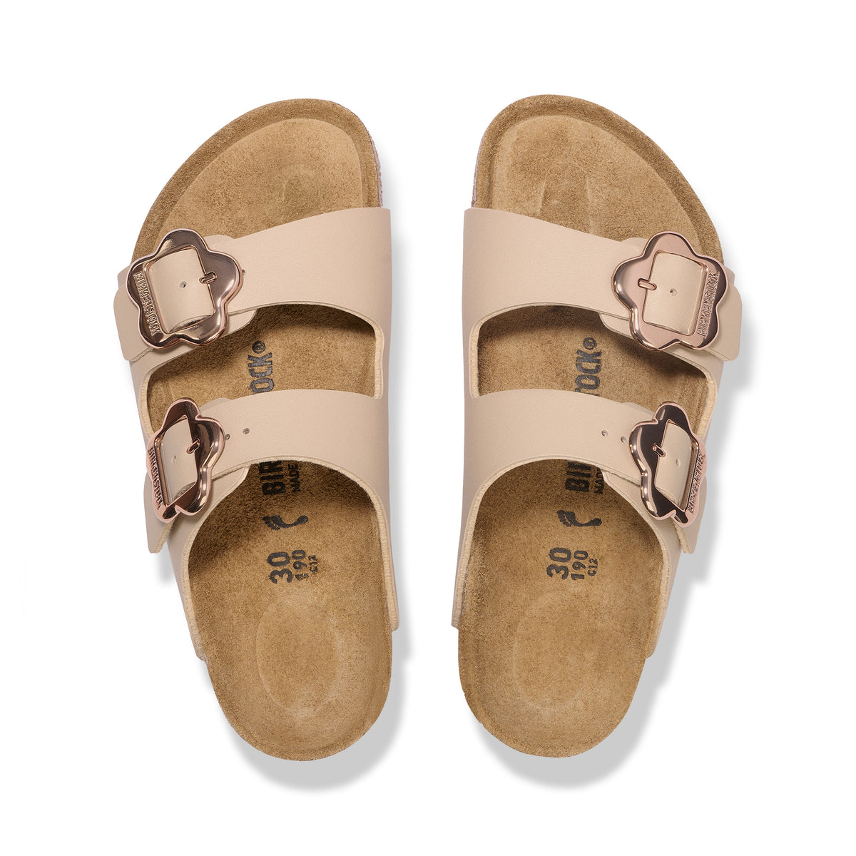 The Birkenstock Arizona is a genuine classic that has been delighting wearers with its timeless design for decades. The two-strap model fits kids’ feet perfectly – even during boisterous play! This version features fun floral buckles. The color-coordinated outsole rounds off the shoe’s look of sophistication. The upper is made from the skin-friendly, hard-wearing synthetic material Birko-Flor.